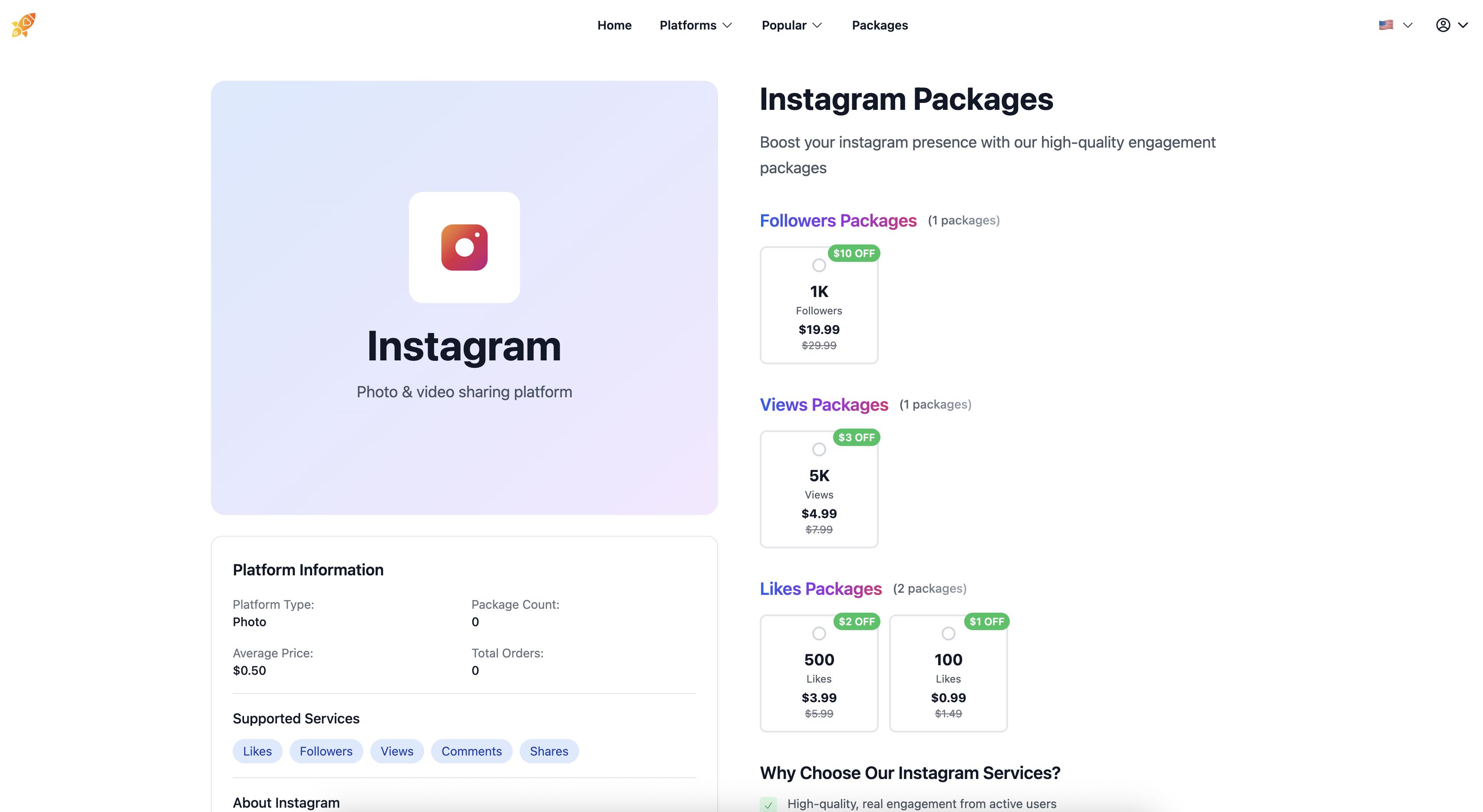 - Advanced Filtering: Search and filter packages by platform, service type, and price
