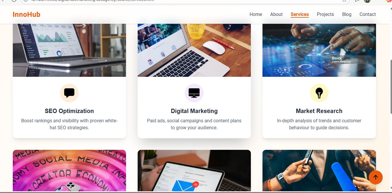 Innovahub is a modern, fully responsive, and professional HTML template designed specifically for digital marketing agencies, SEO experts, content marketers, social media specialists, startups, freelancers, and creative professionals who want to establish a strong online presence. This template combines clean, modern design with powerful functionality, allowing businesses to showcase their services, portfolio, team, and client success stories effectively. With Innovahub, you can present your brand in a way that attracts visitors, engages them, and converts them into leads, making it ideal for agencies, freelancers, and startups looking to build credibility and trust online. The template is fully responsive and mobile-friendly, ensuring a seamless user experience across desktops, tablets, and smartphones. It is built with SEO-optimized code, proper meta tags, headings, and semantic HTML structure, helping your website rank better in search engines and attract more organic traffic. Innovahub also offers fast loading speeds and lightweight design, improving user engagement and reducing bounce rates.