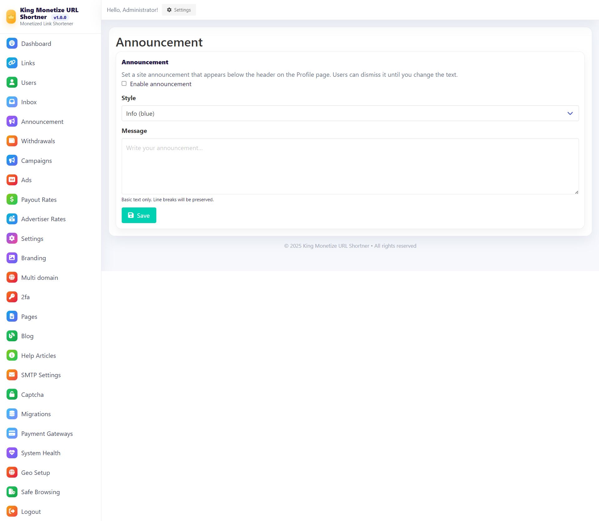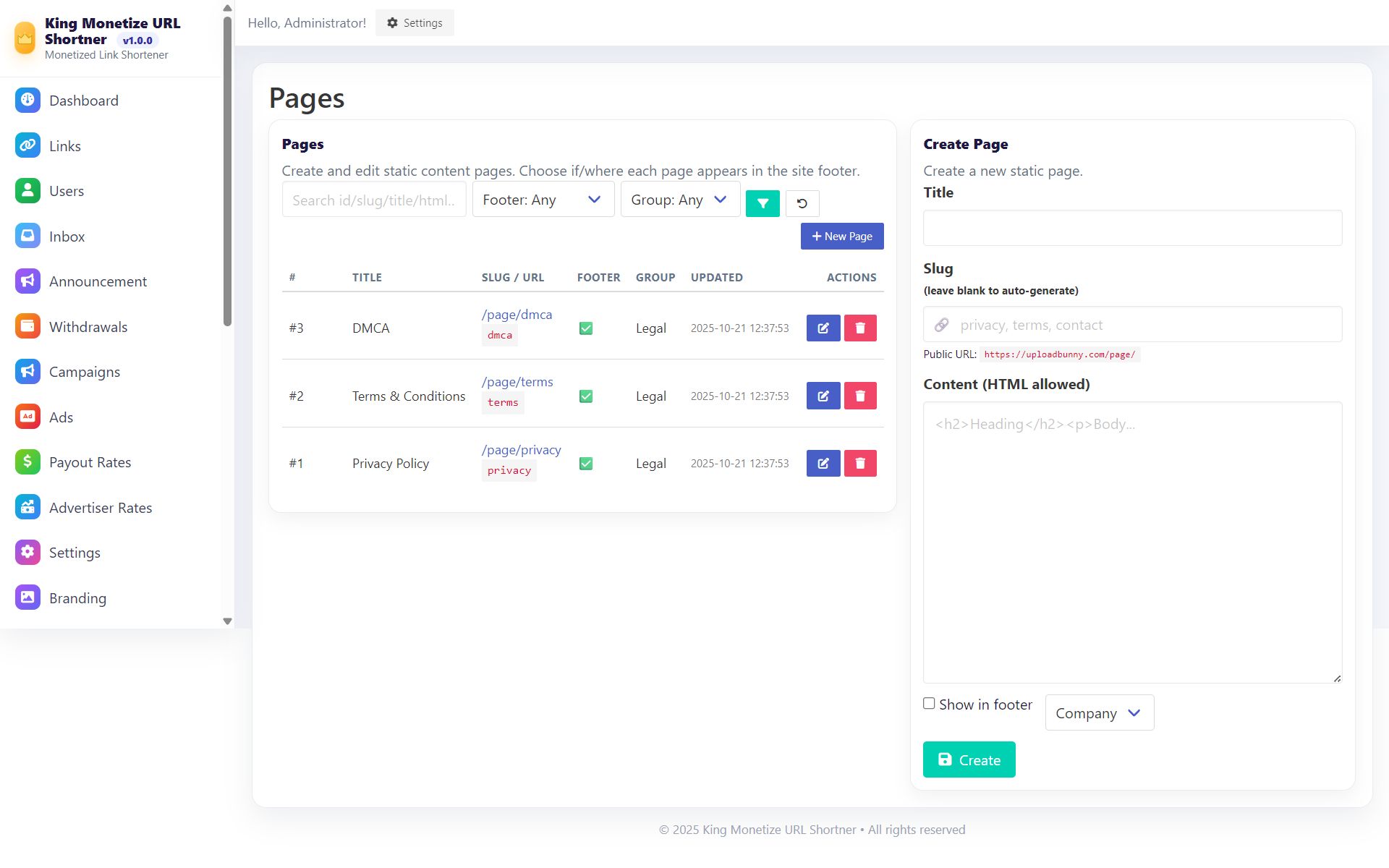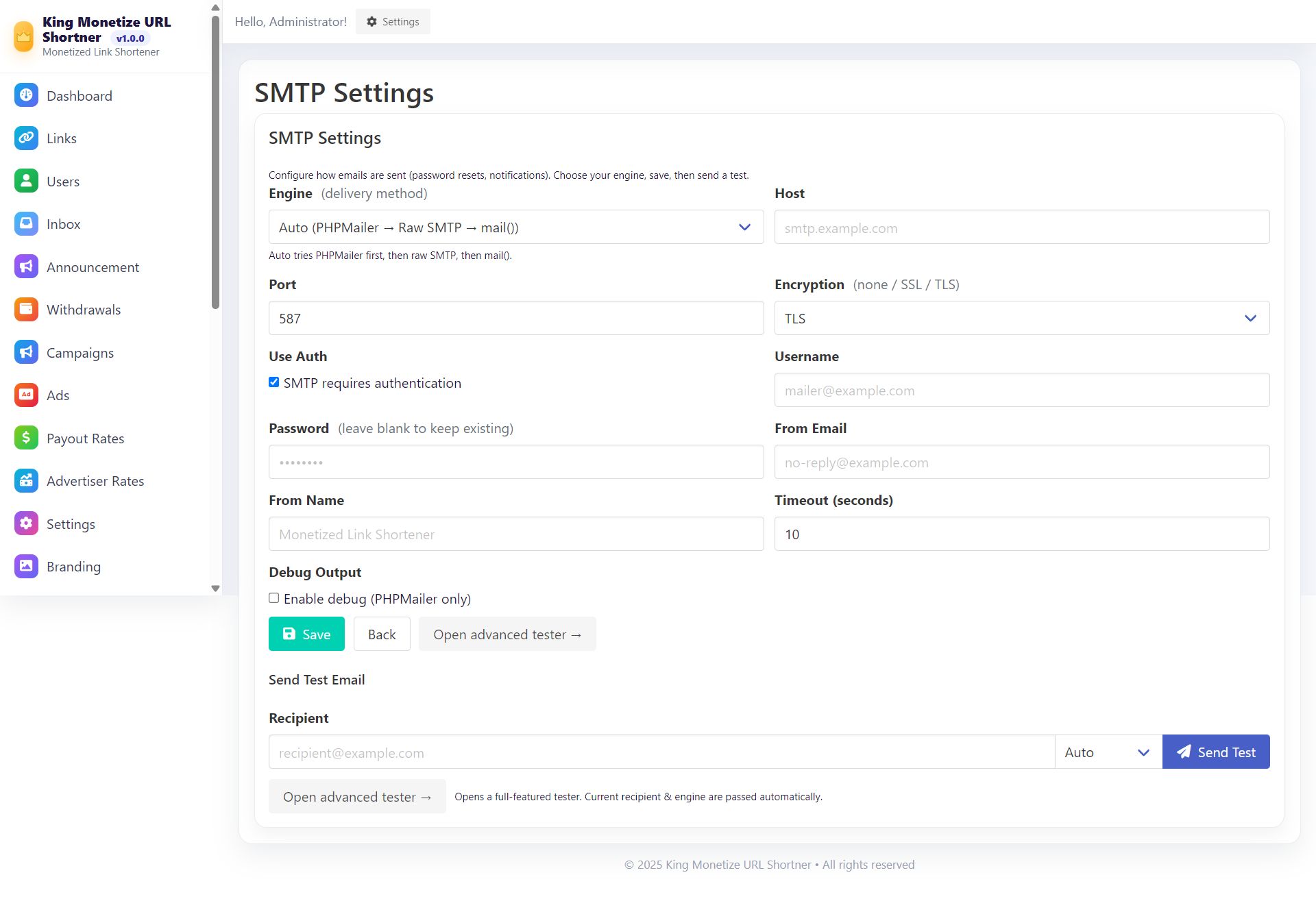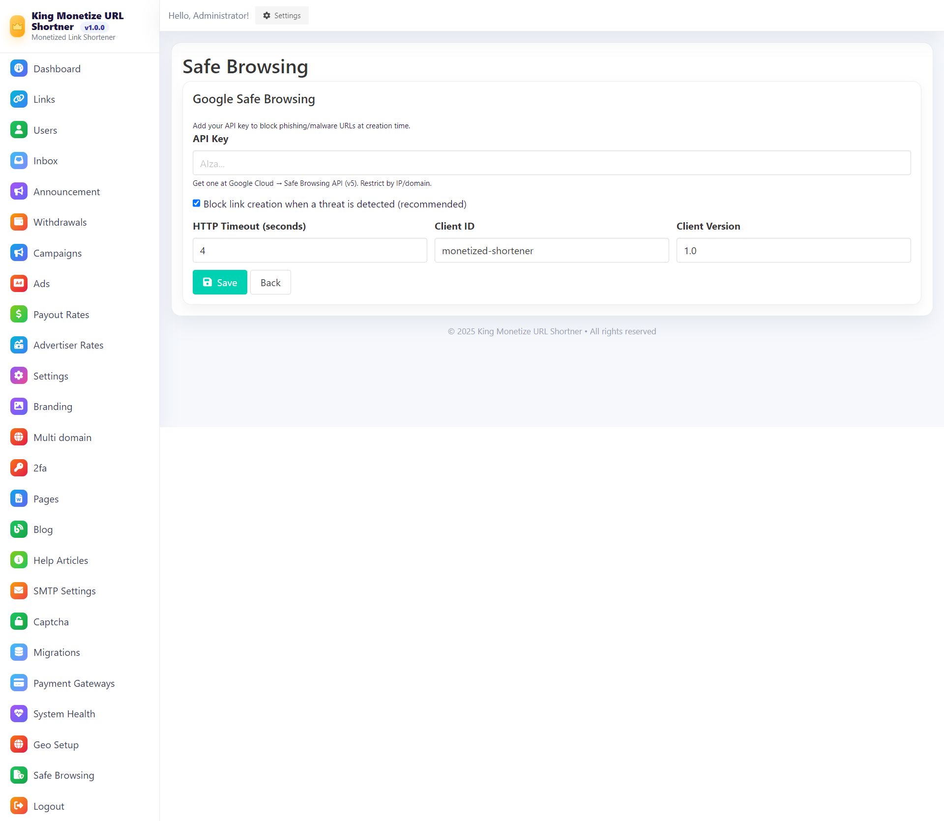 A professional PHP-MySQL URL shortener with built-in monetization, supporting publishers, advertisers, and administratorsKing Monetized URL Shortener