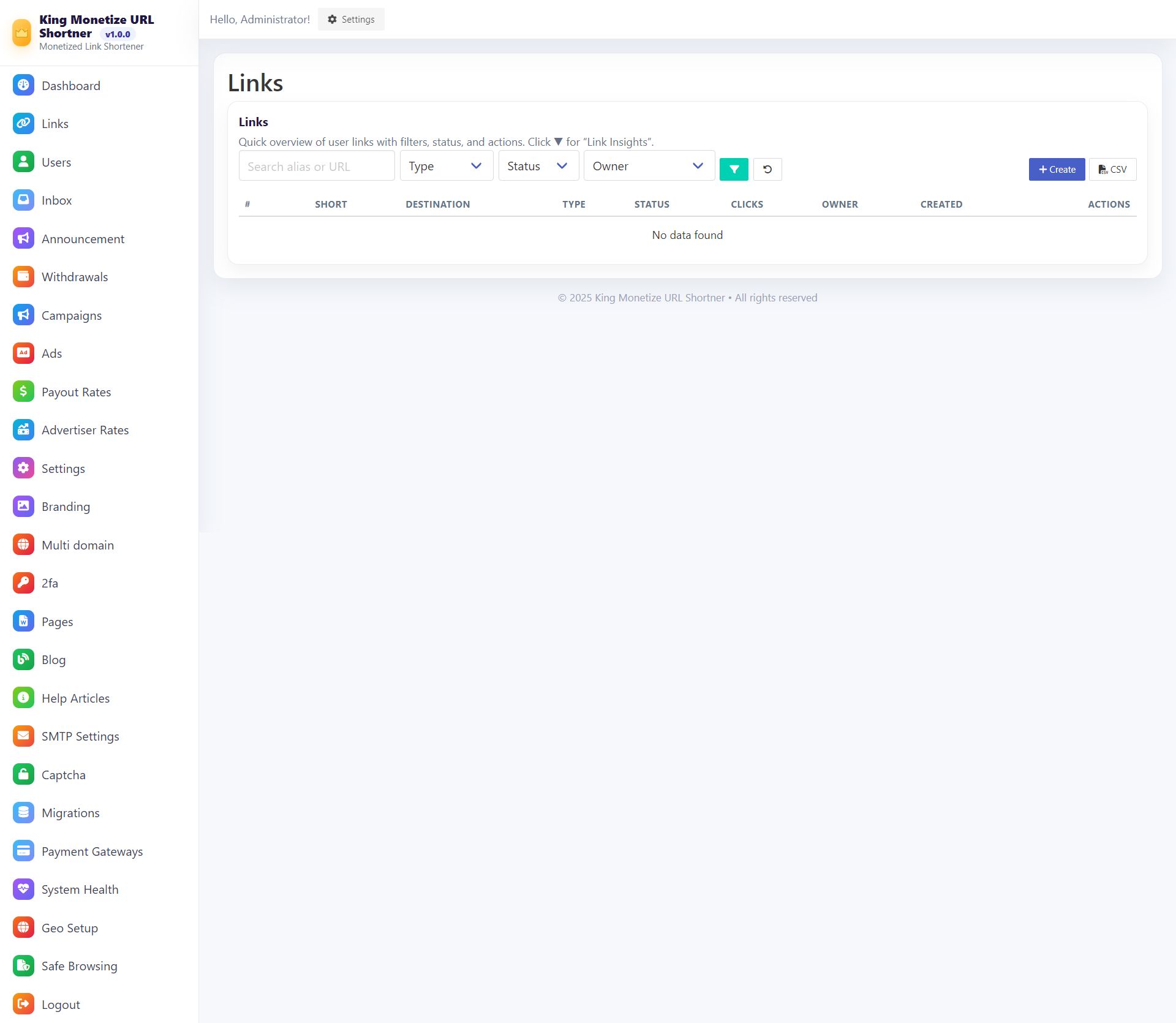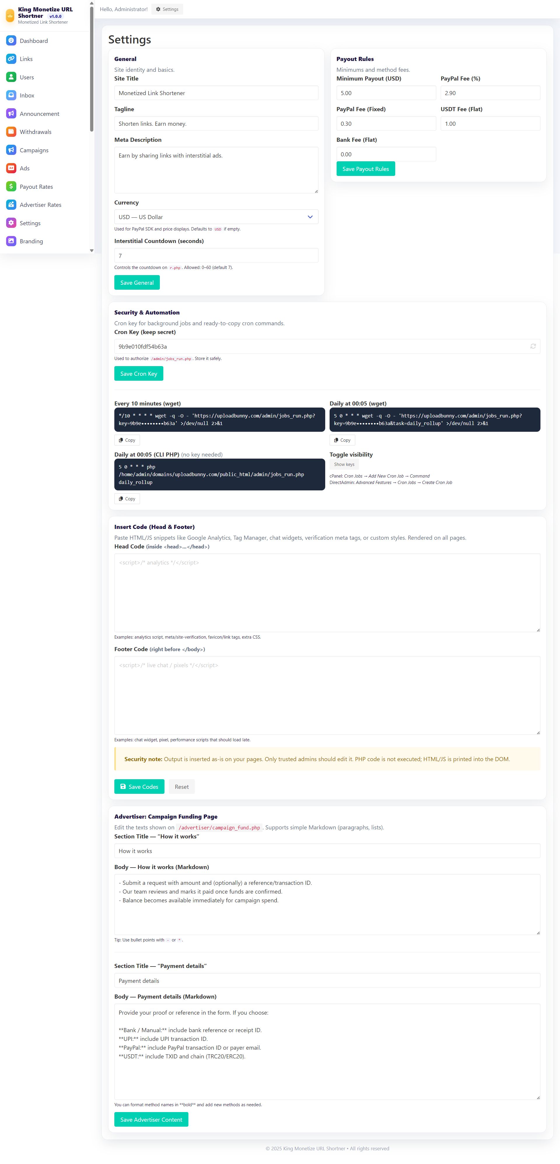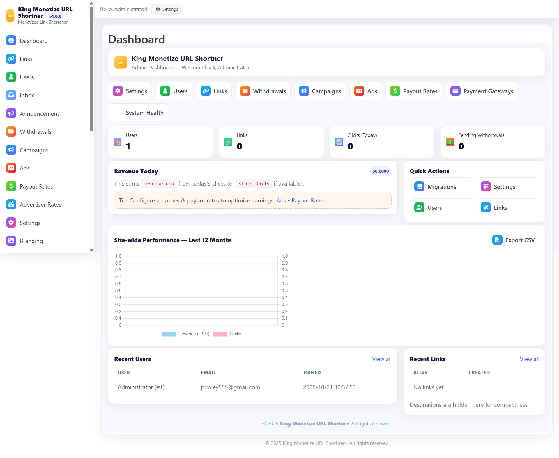 | Tags | url shortener script, analytics dashboard, referral system, link management, php url shortener, king monetized url shortener, monetized link shortener, ad network script, advertiser publisher platform, cpm campaigns, link monetization, multi-domain support |