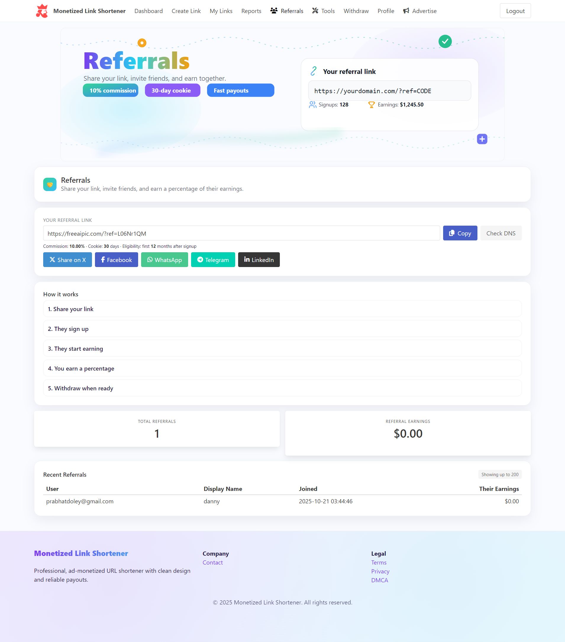- Frontend: landing, link creator, dashboard, reports, referrals