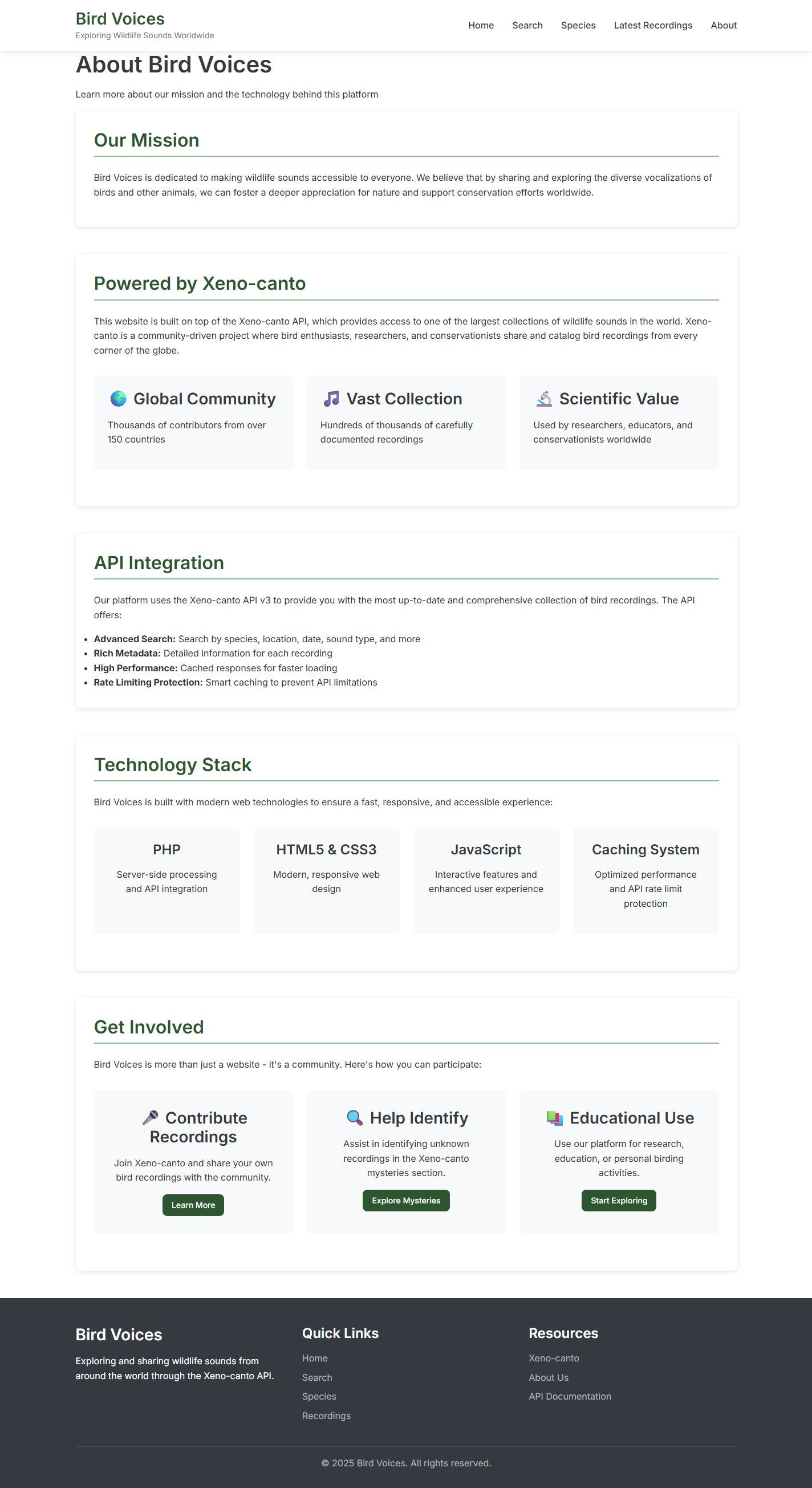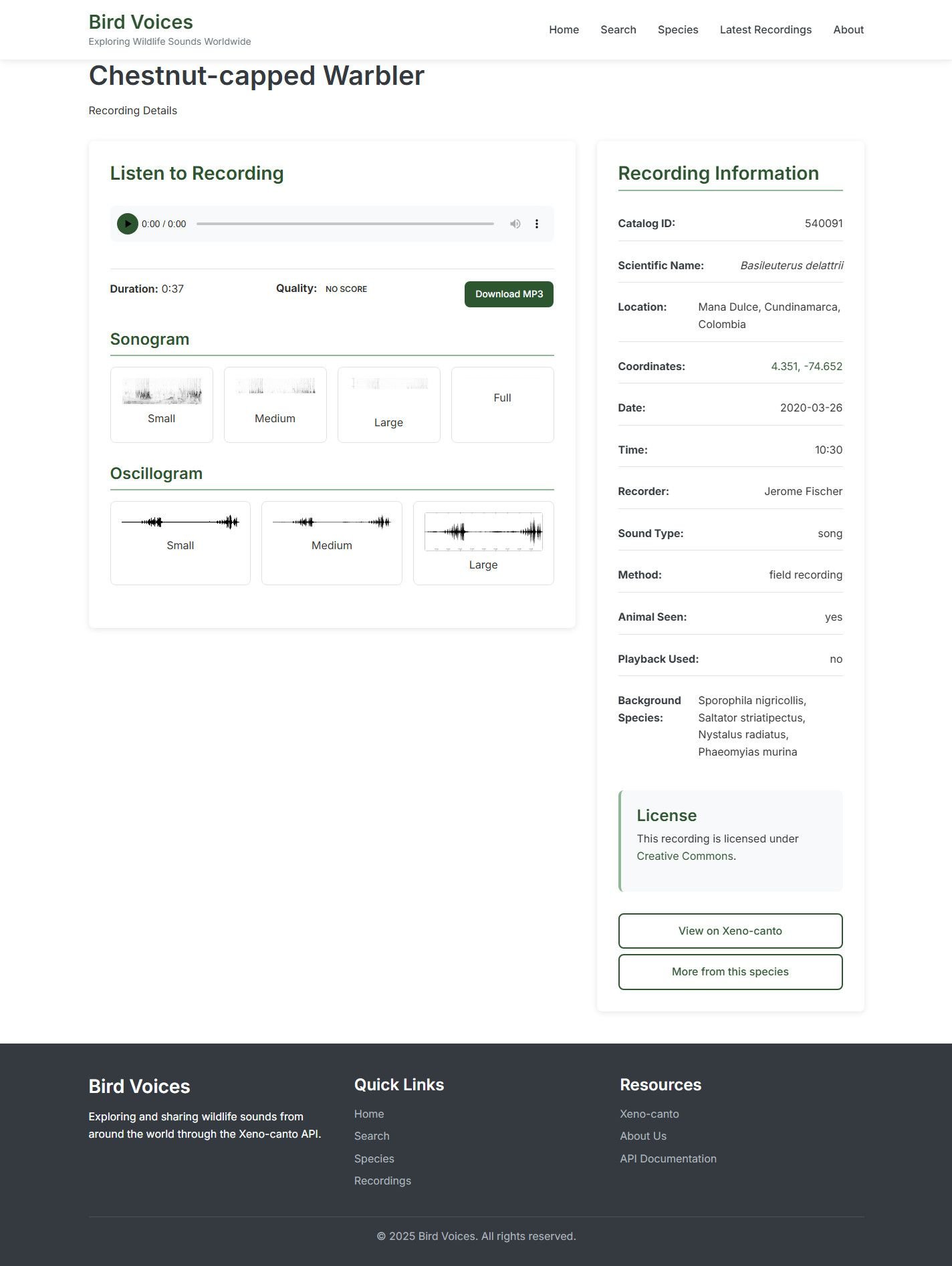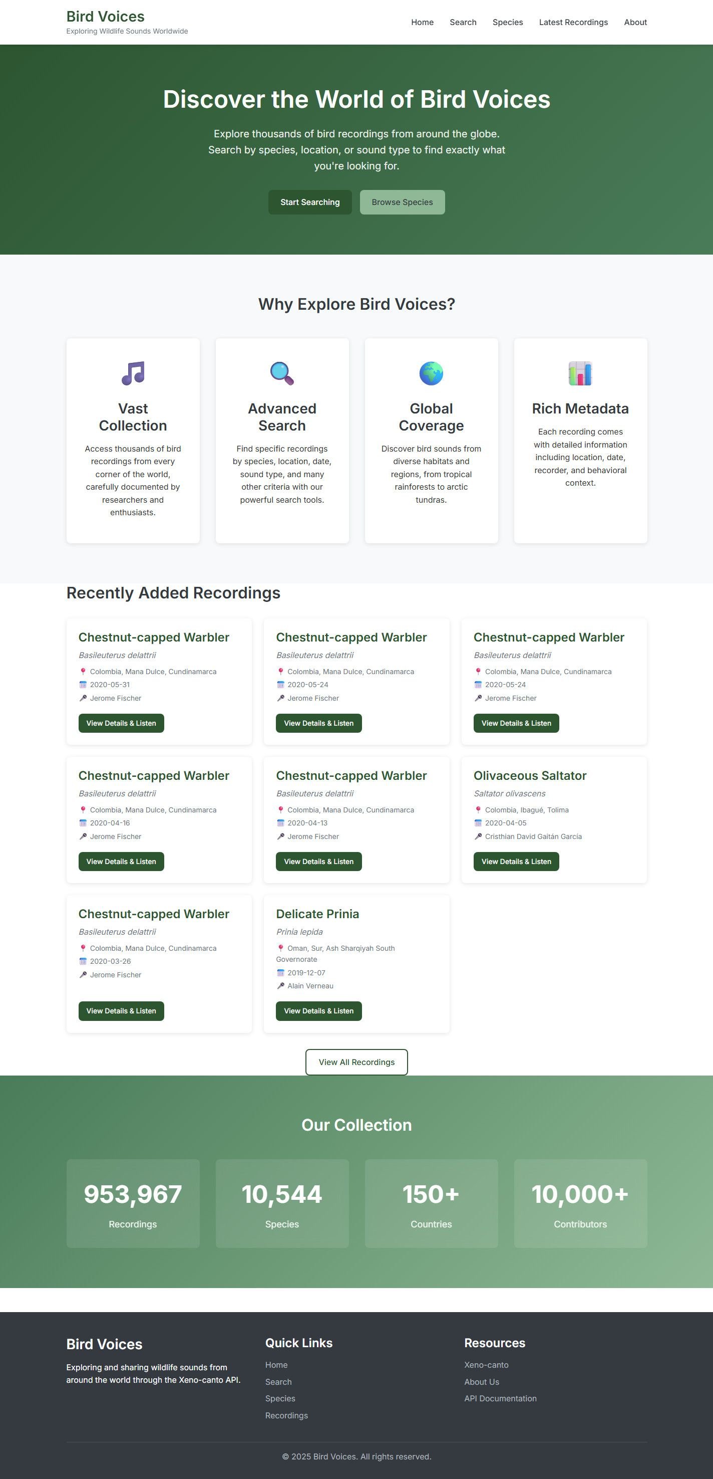 It features a responsive, modern UI that adapts perfectly to any device, from desktops to smartphones. With a powerful caching system, your site stays fast and reliable while preventing API rate-limit issues. The advanced search and species browser let users explore bird voices effortlessly — by name, family, or alphabetical order.