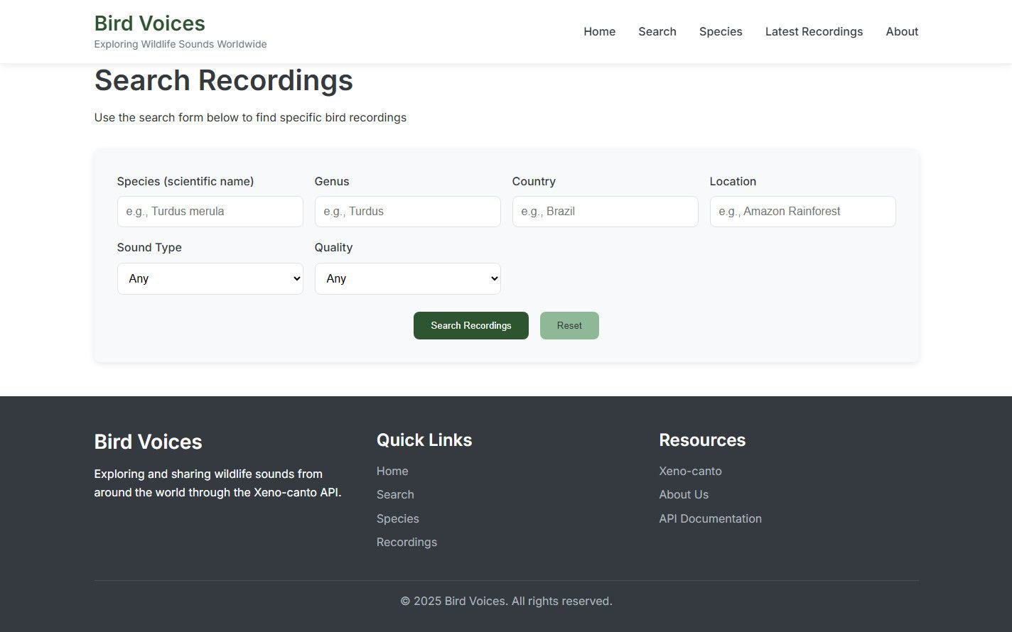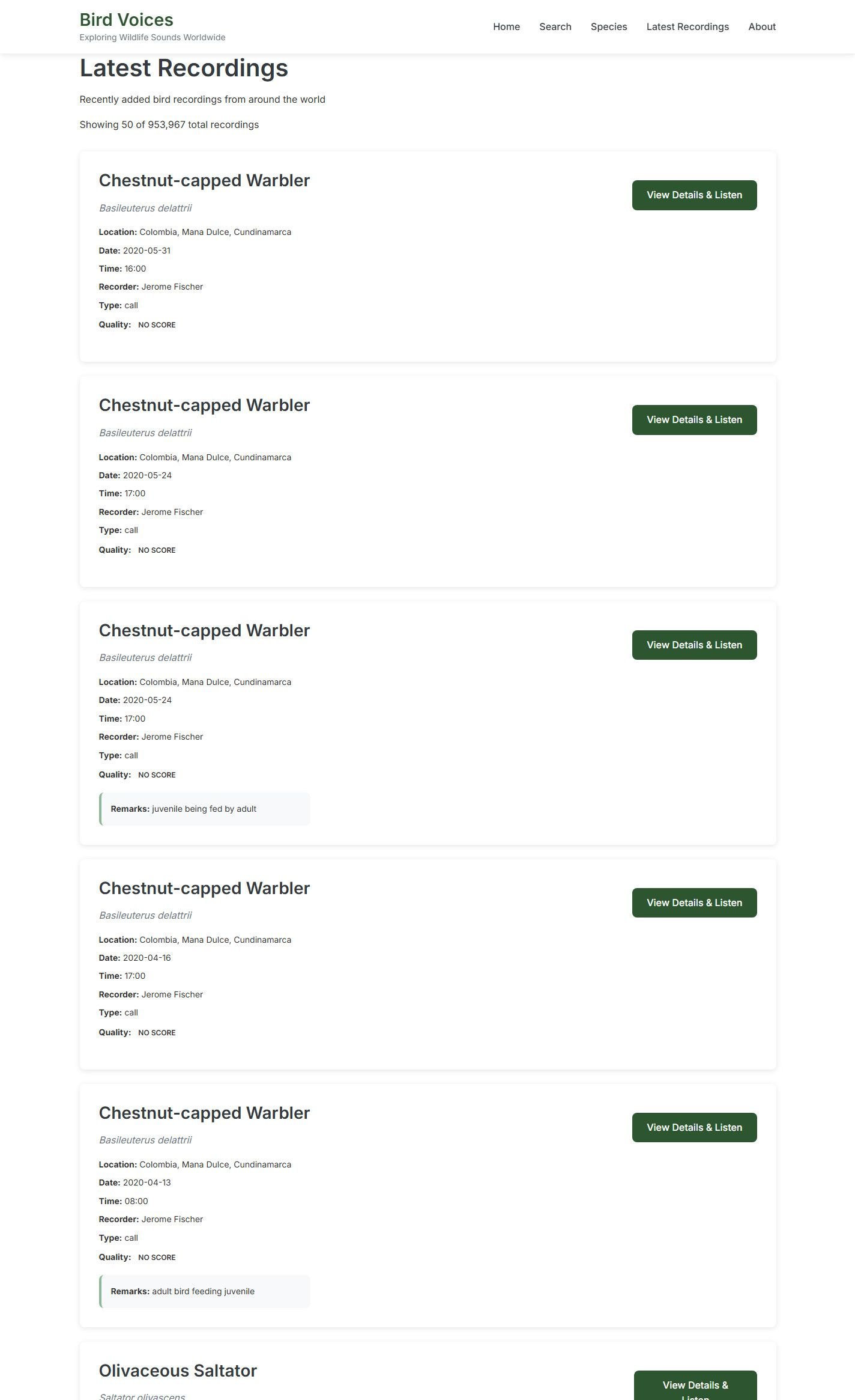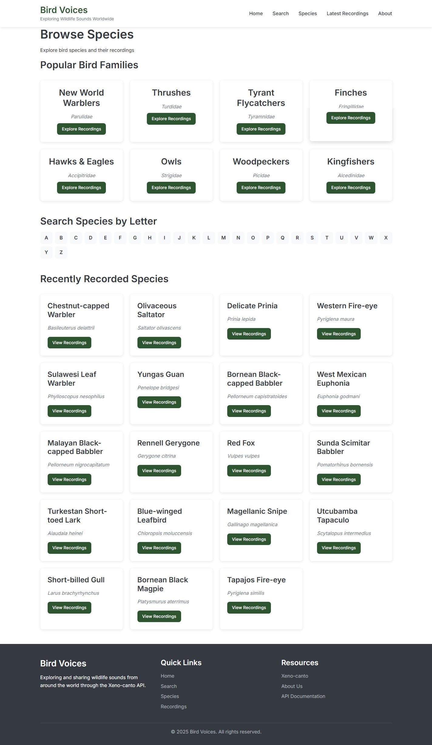 It features a responsive, modern UI that adapts perfectly to any device, from desktops to smartphones. With a powerful caching system, your site stays fast and reliable while preventing API rate-limit issues. The advanced search and species browser let users explore bird voices effortlessly — by name, family, or alphabetical order.