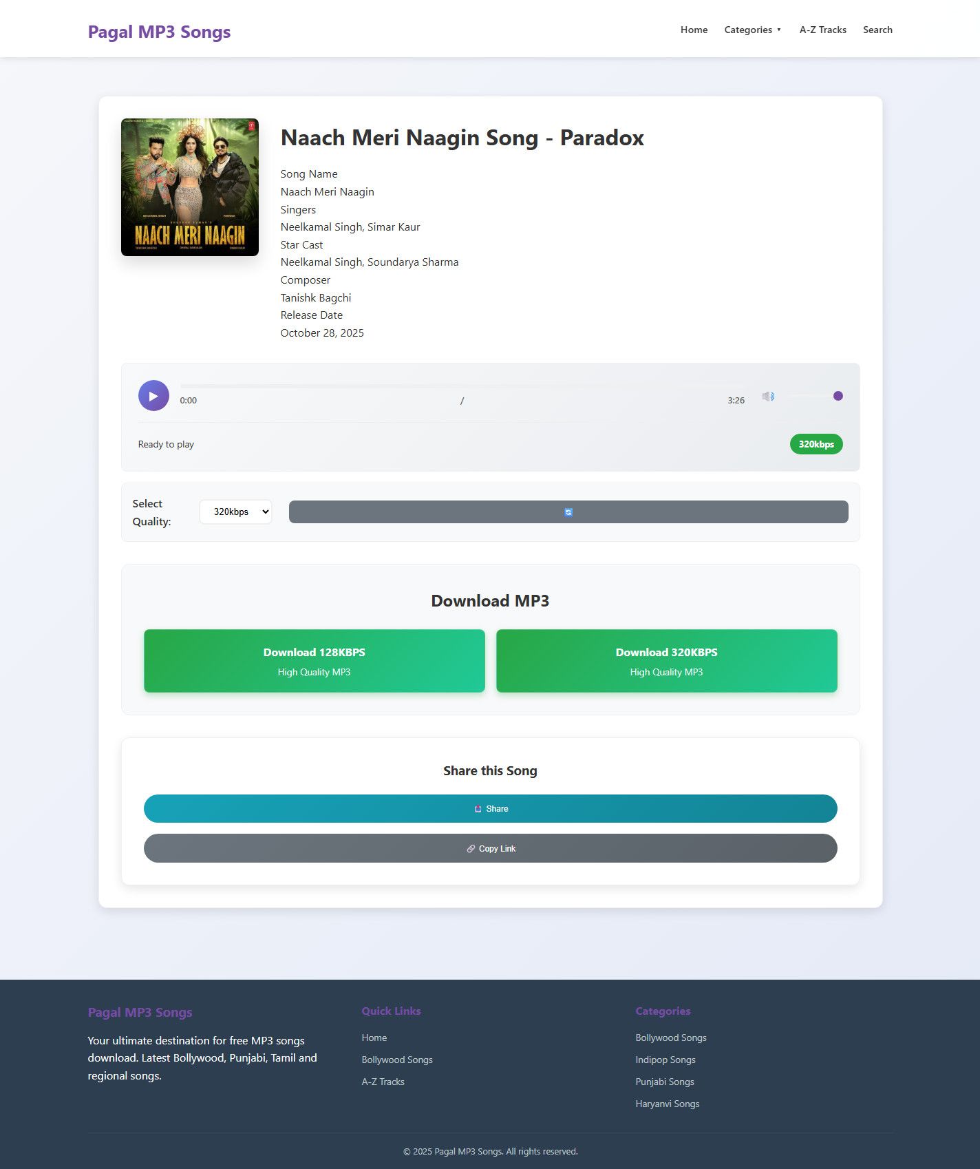 PagalMp3 Songs Portal PHP Script is a fully responsive, ready-to-use music website script with modern UI, caching, ads, and SEO optimization. Launch your own MP3 songs portal instantly with smooth navigation, search, and secure performance.