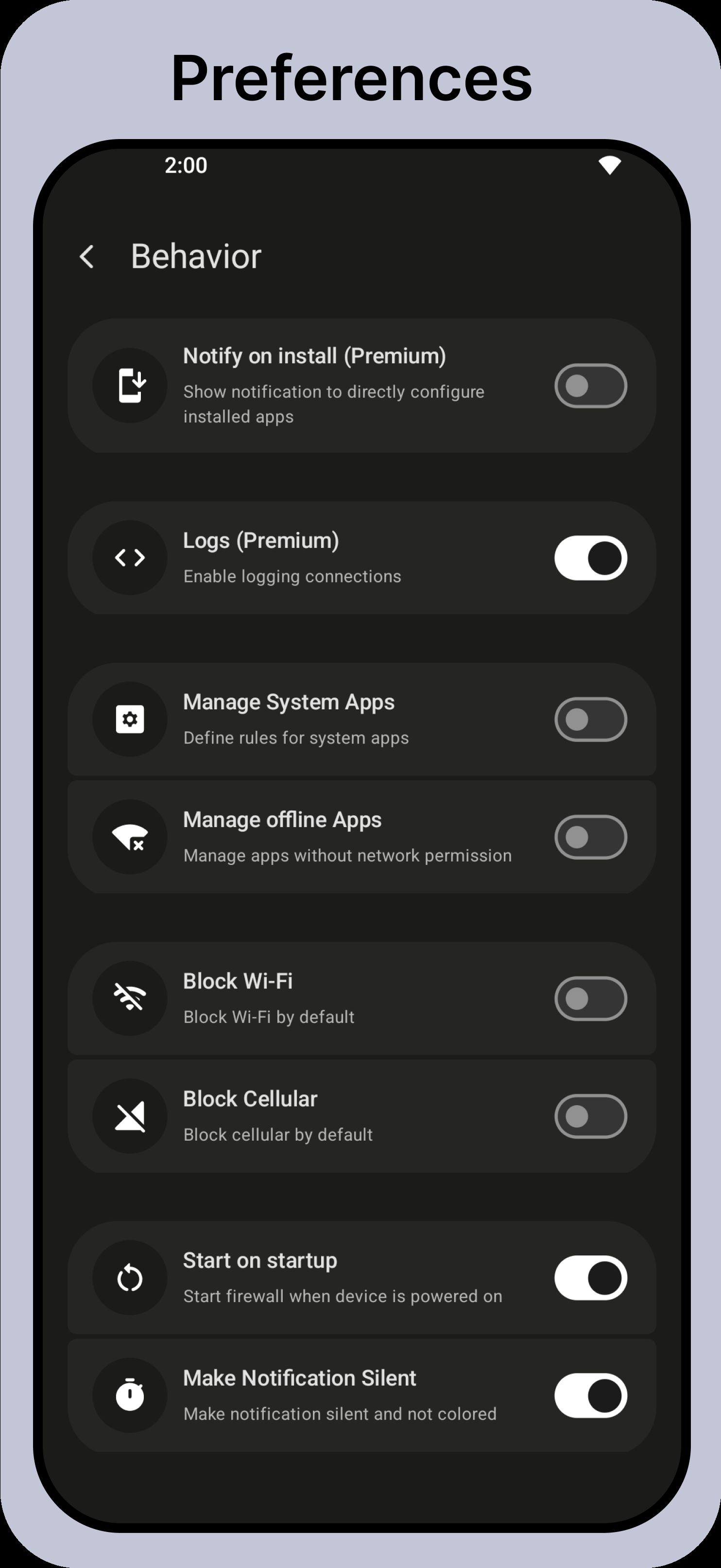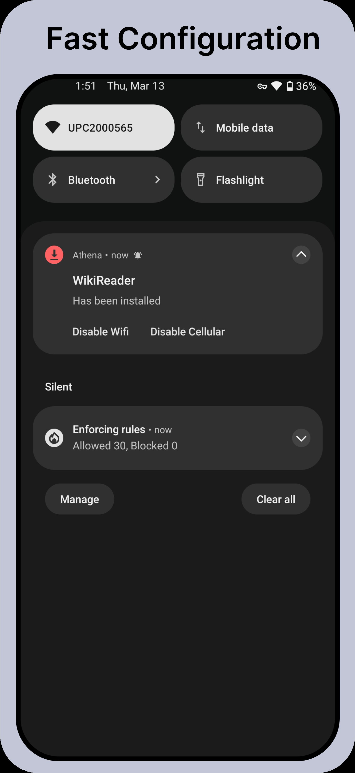 Athenex gives you deep network control, allowing you to monitor and block internet access for any app, including system apps. It stops trackers, analytics, fingerprinting, malicious websites, and unauthorized data transmission.