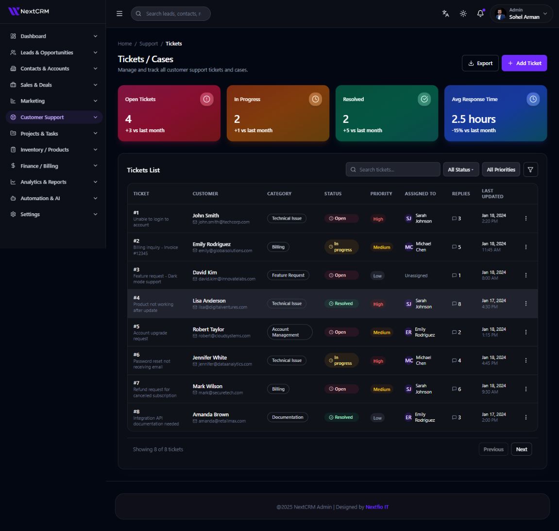 NextCRM is a modern React + TypeScript admin dashboard template for CRM software. Built with Vite and Tailwind CSS, it provides blazing-fast dev experience, responsive layout, dark/light modes, RTL support, and an extensive UI kit. Every major CRM module is covered- leads, sales, marketing, automation, finance, inventory, projects, support, and settings, so you can plug in your backend and ship rapidly.Â