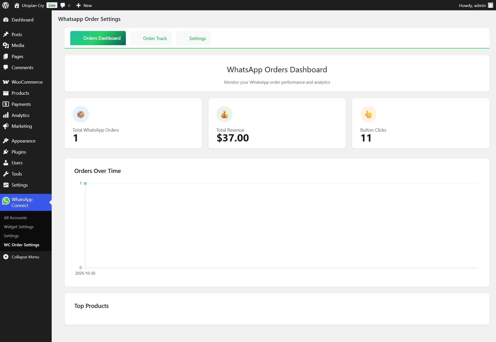 - Orders logging and analytics: total WhatsApp orders, revenue, clicks, charts, top products