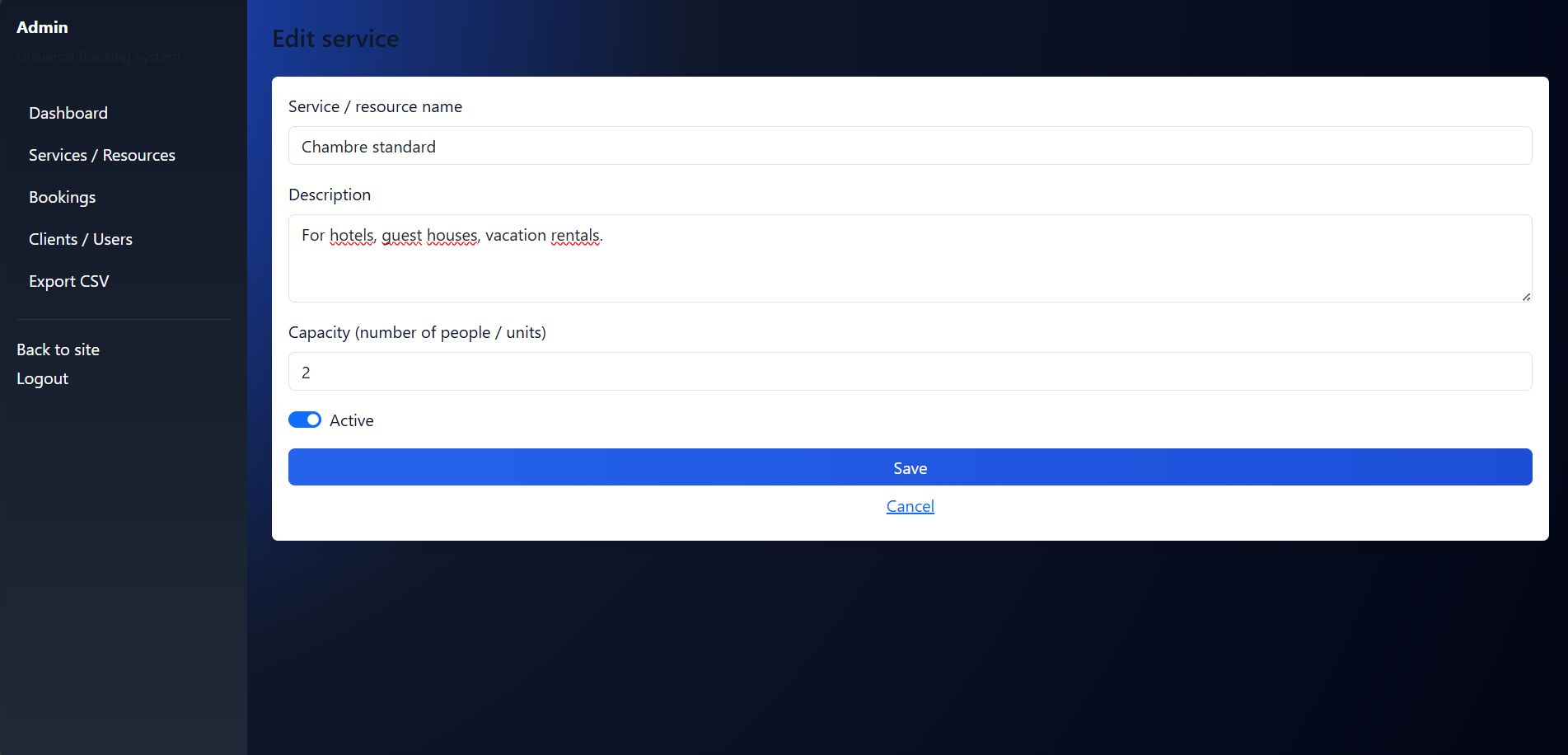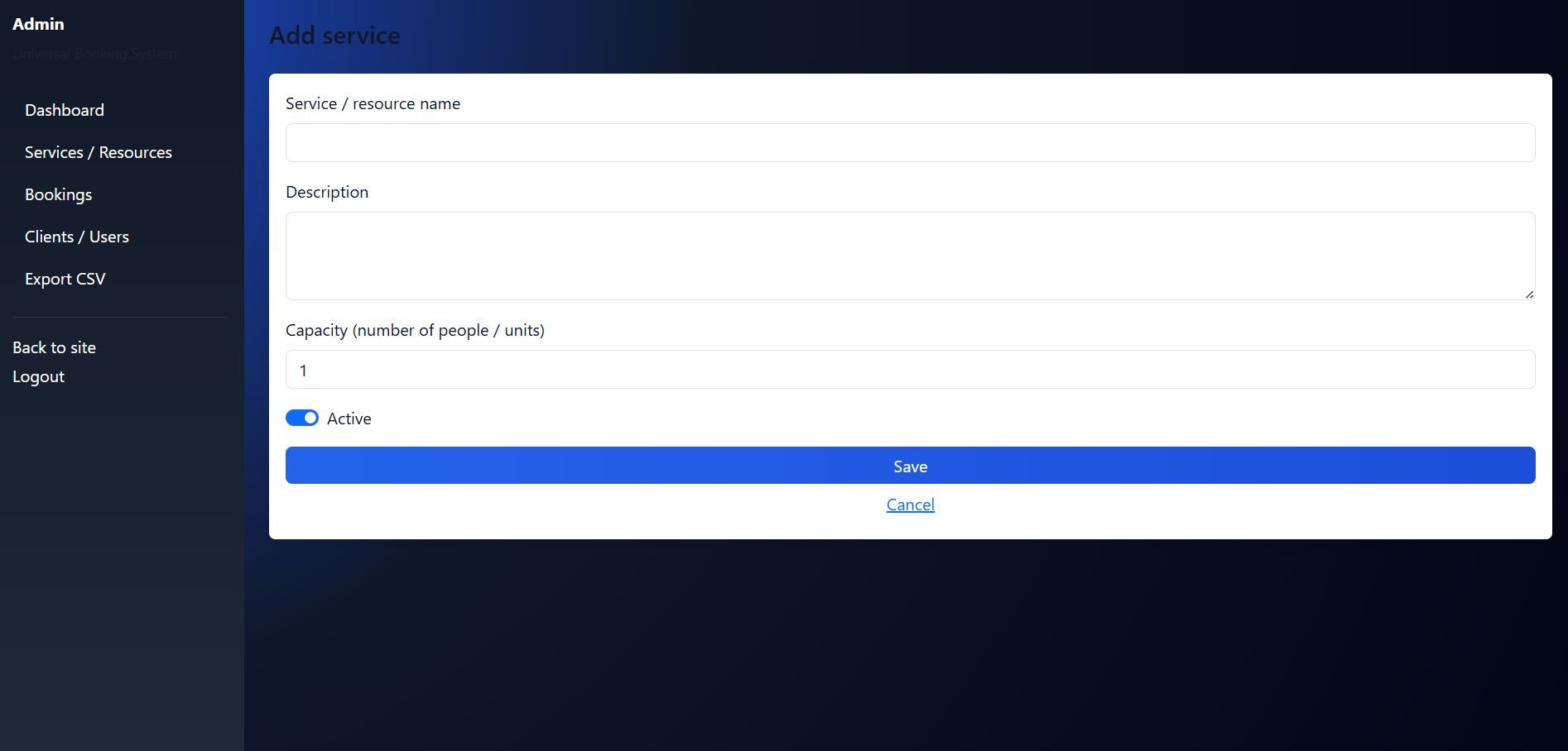 Universal Booking System is a flexible PHP & MySQL appointment and reservation script.It can be used for hotels, salons, rentals, medical appointments and more. The system is built with native PHP (no framework) and Bootstrap 5 with a modern, responsive design.