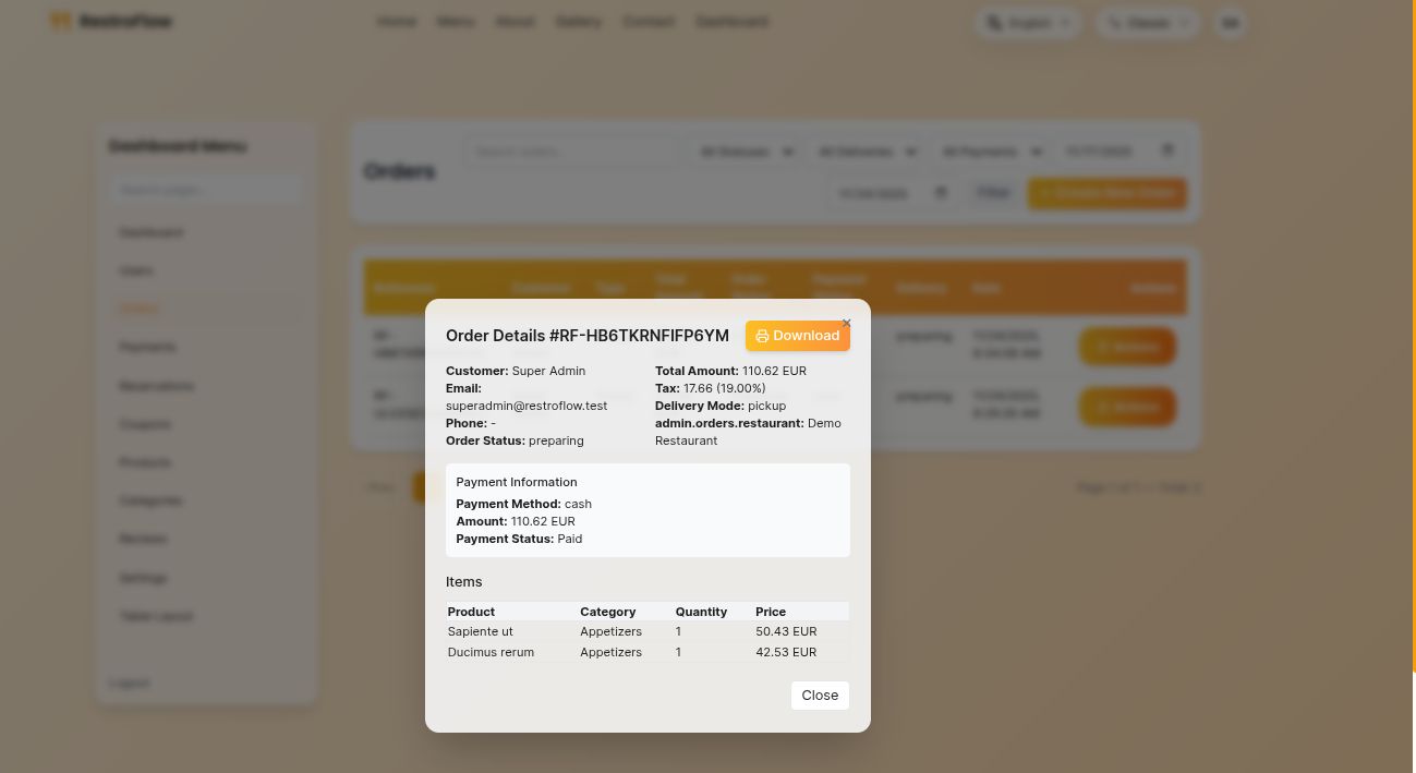 RestroFlow is a complete restaurant management system with an API-first architecture, built using Laravel 12, PHP 8+, Vue 3 and Vite. It includes an admin panel, staff panel, customer dashboard, and a fully documented REST API powered by an OpenAPI 3 (Swagger) specification. Perfect for building SaaS platforms, POS systems, delivery apps, or custom mobile and web frontends.
