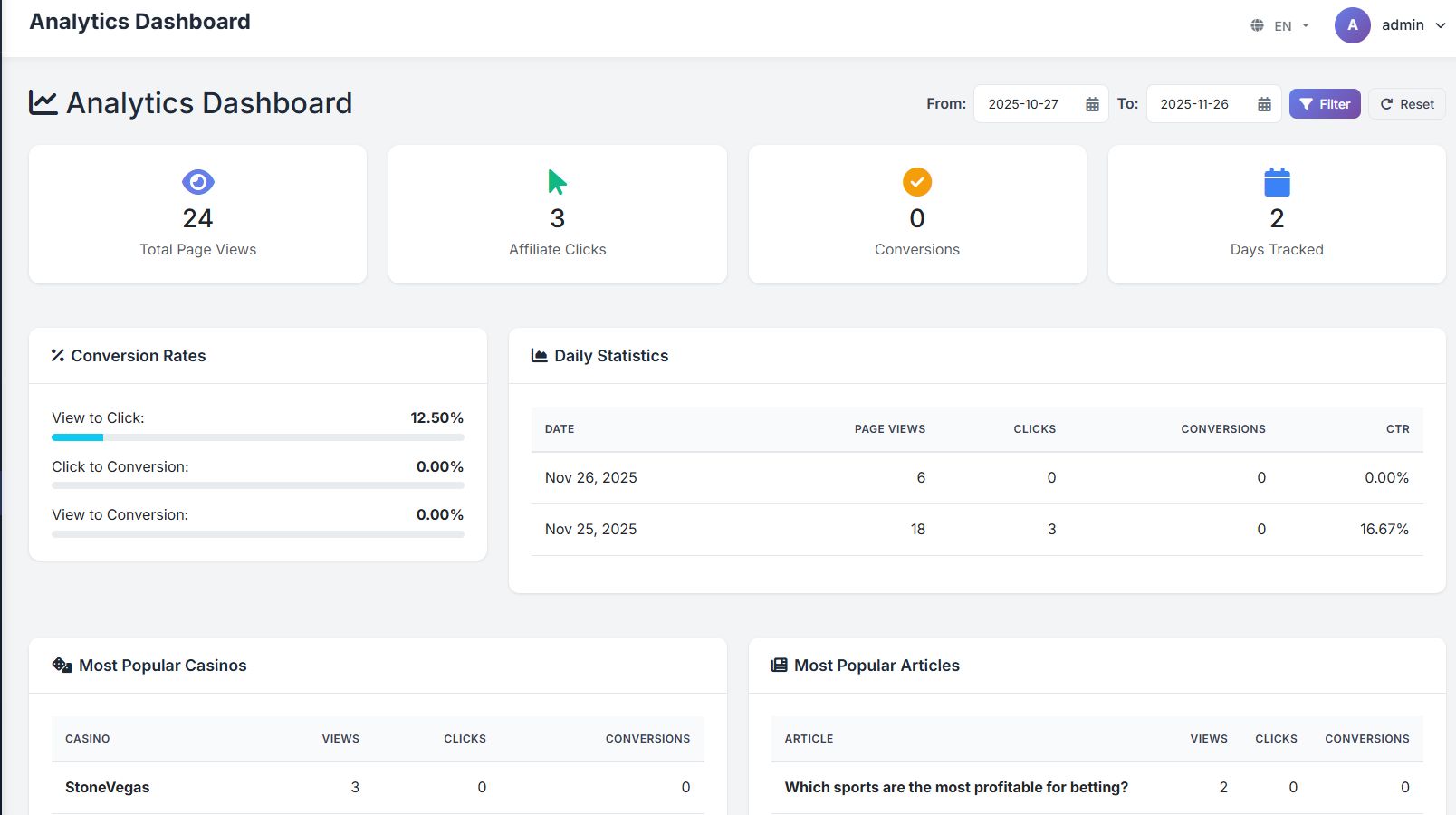 Track clicks, outbound traffic, user interest, and offer performance to understand which casinos convert best.