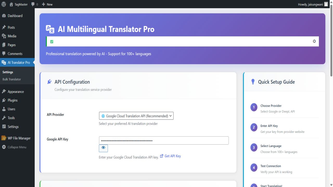 - Select your API Provider (Google or DeepL) and enter your API Key.