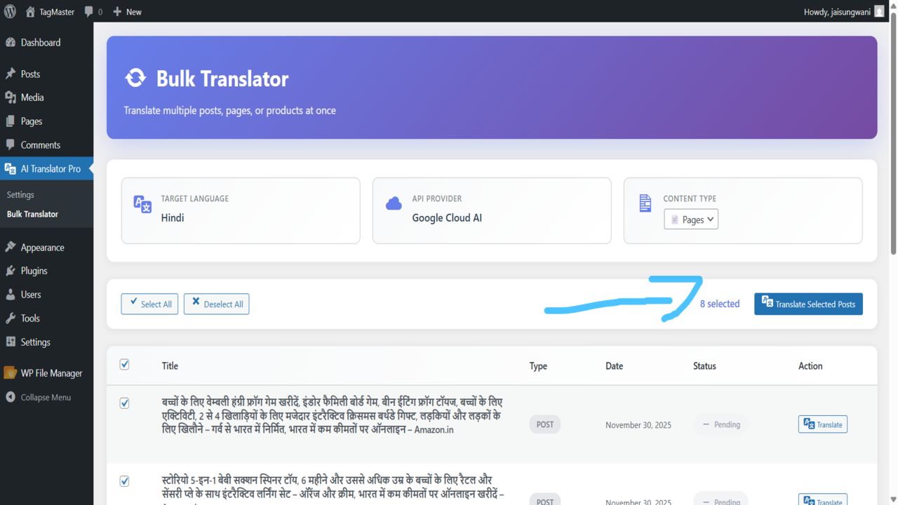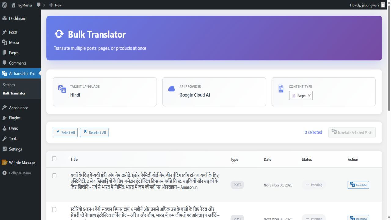 - Bulk Translation:Â Translate hundreds of posts, pages, or products in one go without reloading the page.