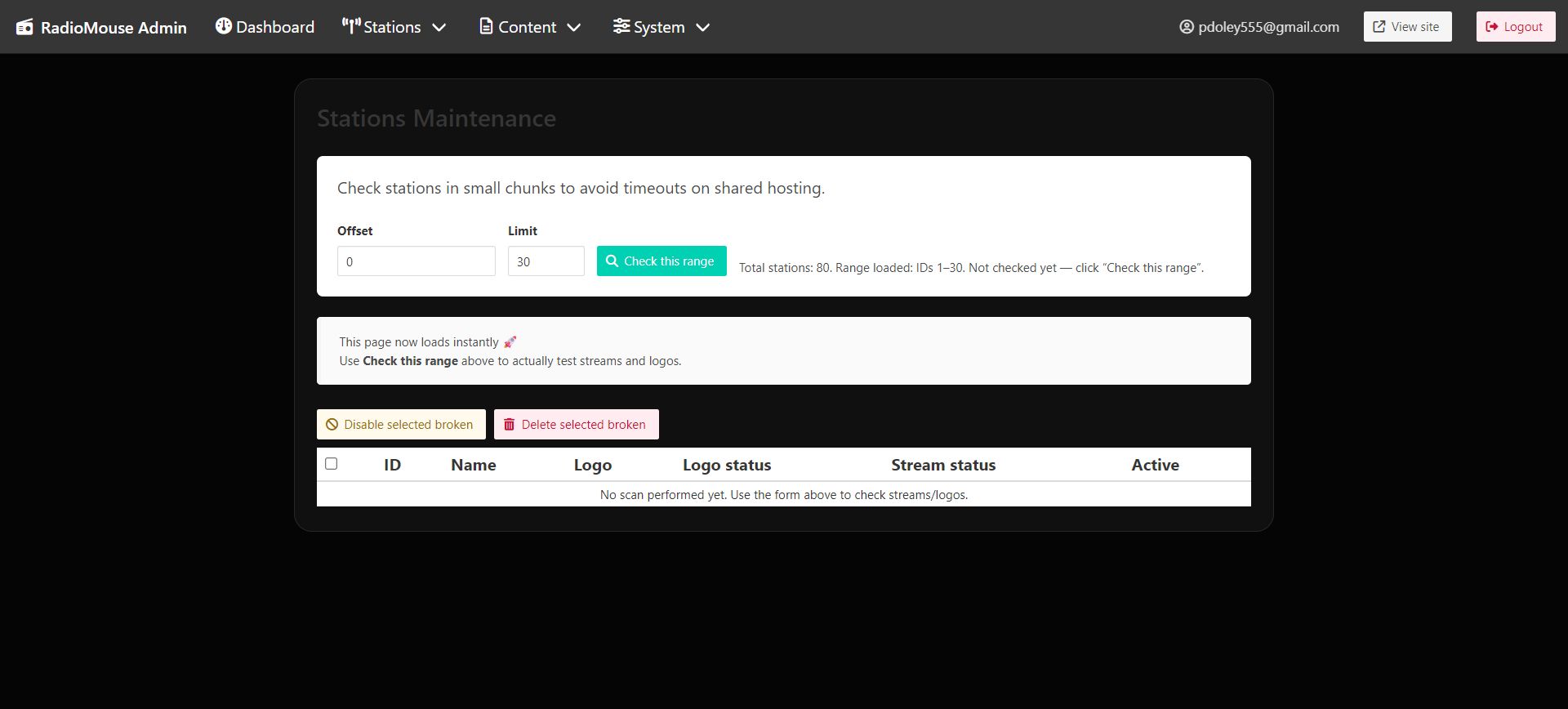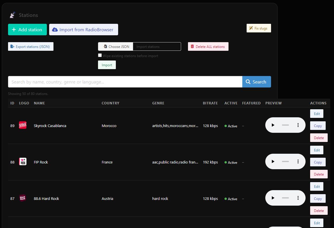 RadioMouse is a modern PHP radio portal script that lets you create a fast and stylish online radio directory with live streaming support for Icecast, Shoutcast, HLS/M3U8, AAC, and MP3. It features a sleek Bulma UI, global audio player with EQ visualizer, station pages, PWA support, and a powerful admin panel to manage stations and settings easily.