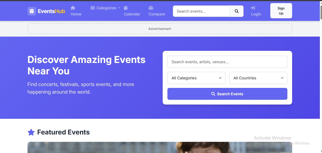 A modern live events & festivals portal with auto API fetching, multi-language support, user accounts, and full admin control.EventsHub – Live Events And Festivals Portal