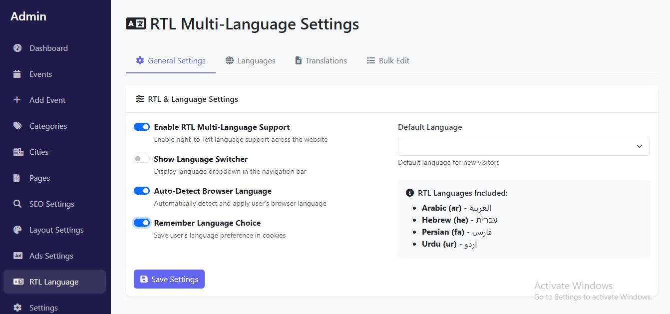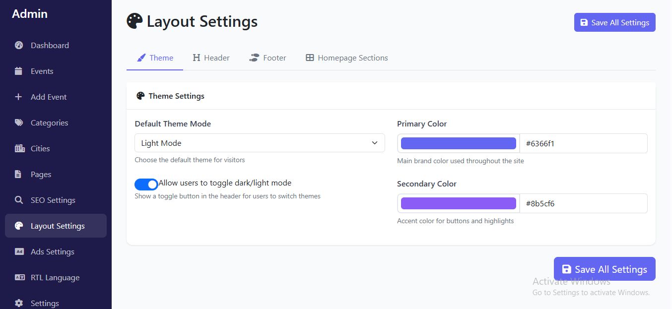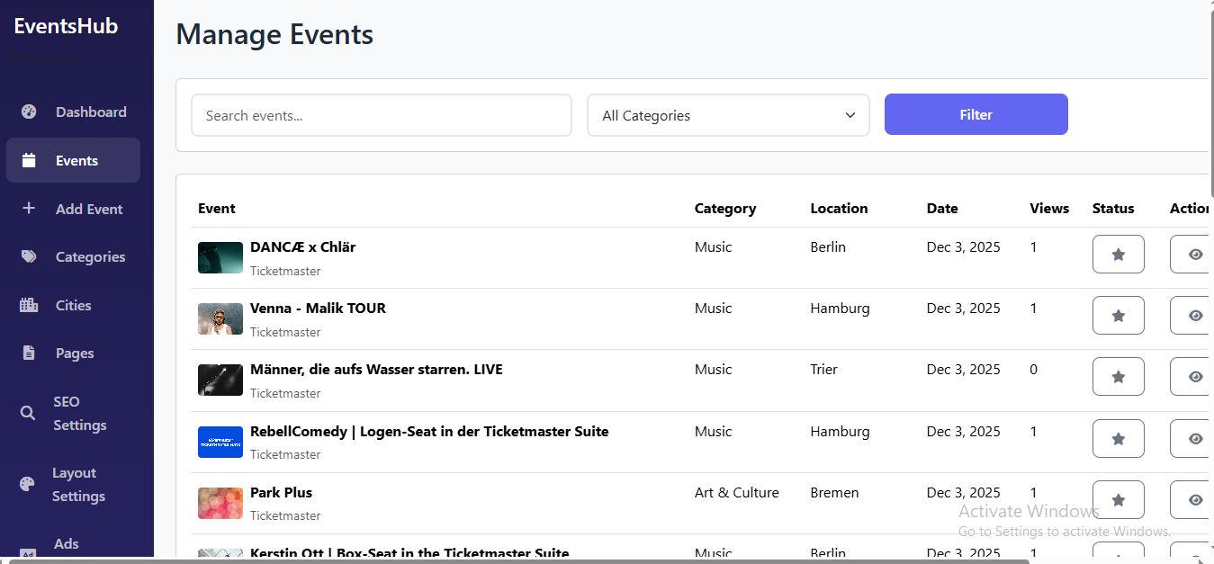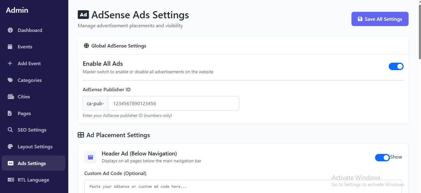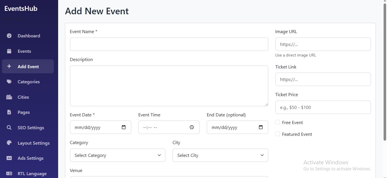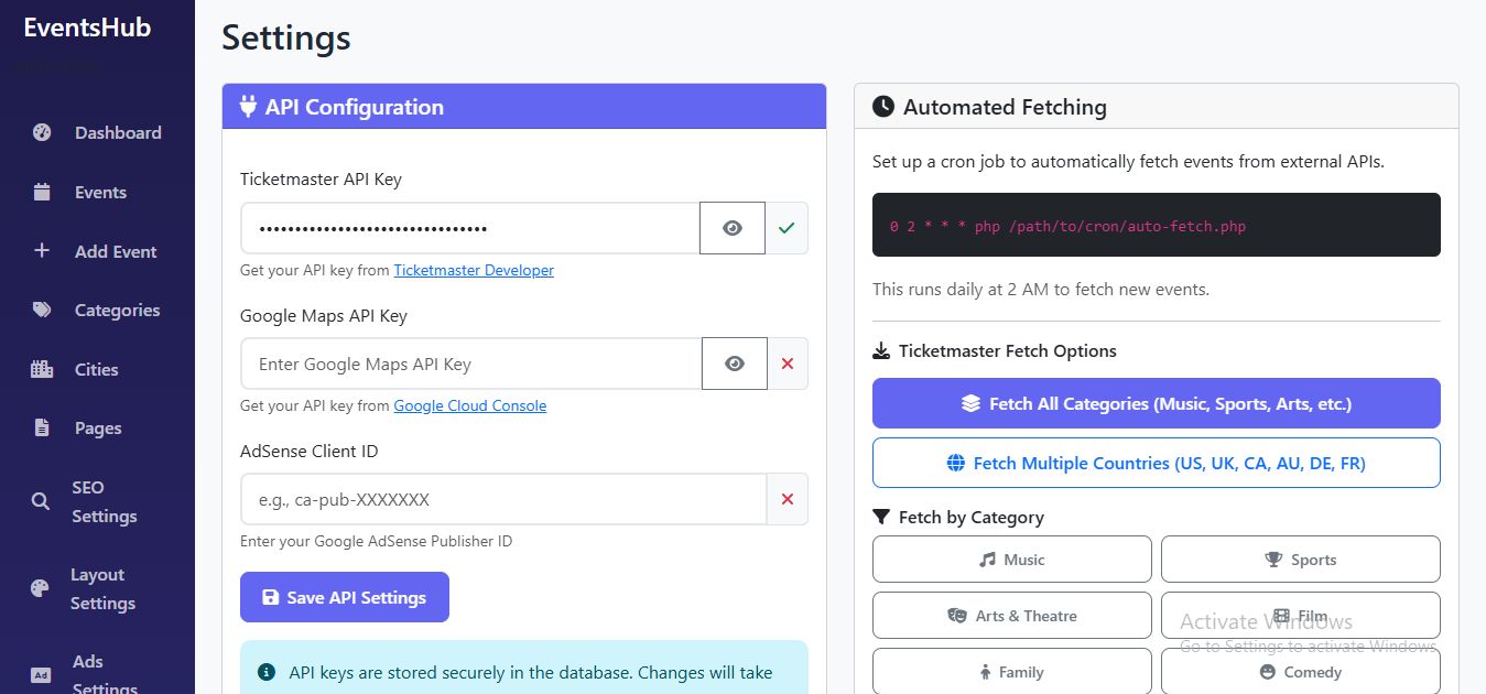 EventsHub also includes a robust Admin Dashboard where you can manage events, categories, cities, languages, users, ads, and SEO settings. You can add events manually or let the system automatically fetch fresh events using your API key. The built-in AdSense Manager allows you to place ads anywhere without editing code.