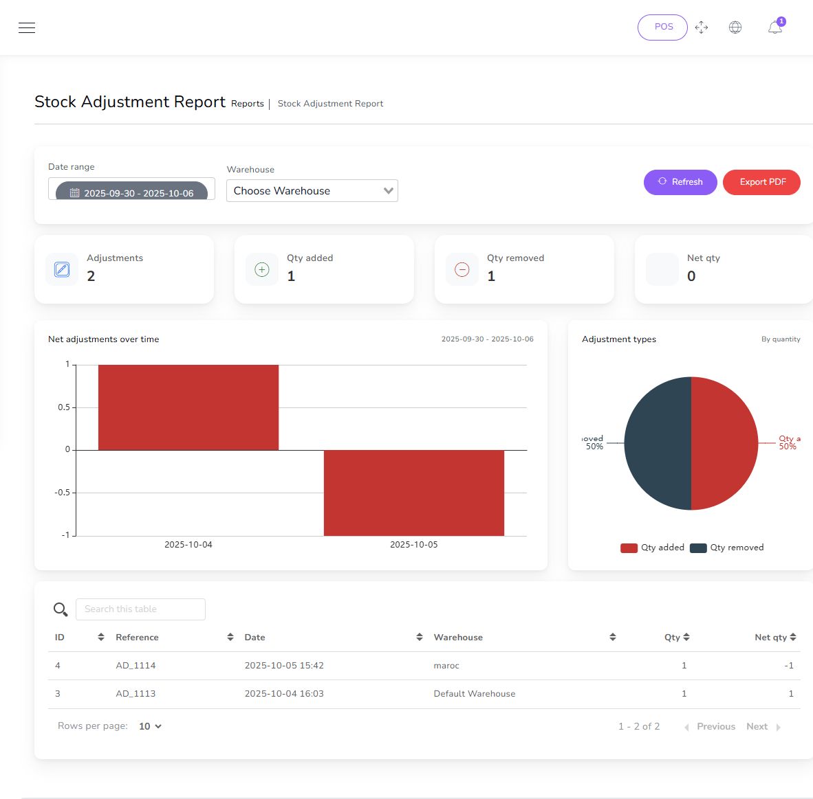 - Inventory Management: Items, adjustments, transfers, product quantity alerts, and warehouse stock overview charts.