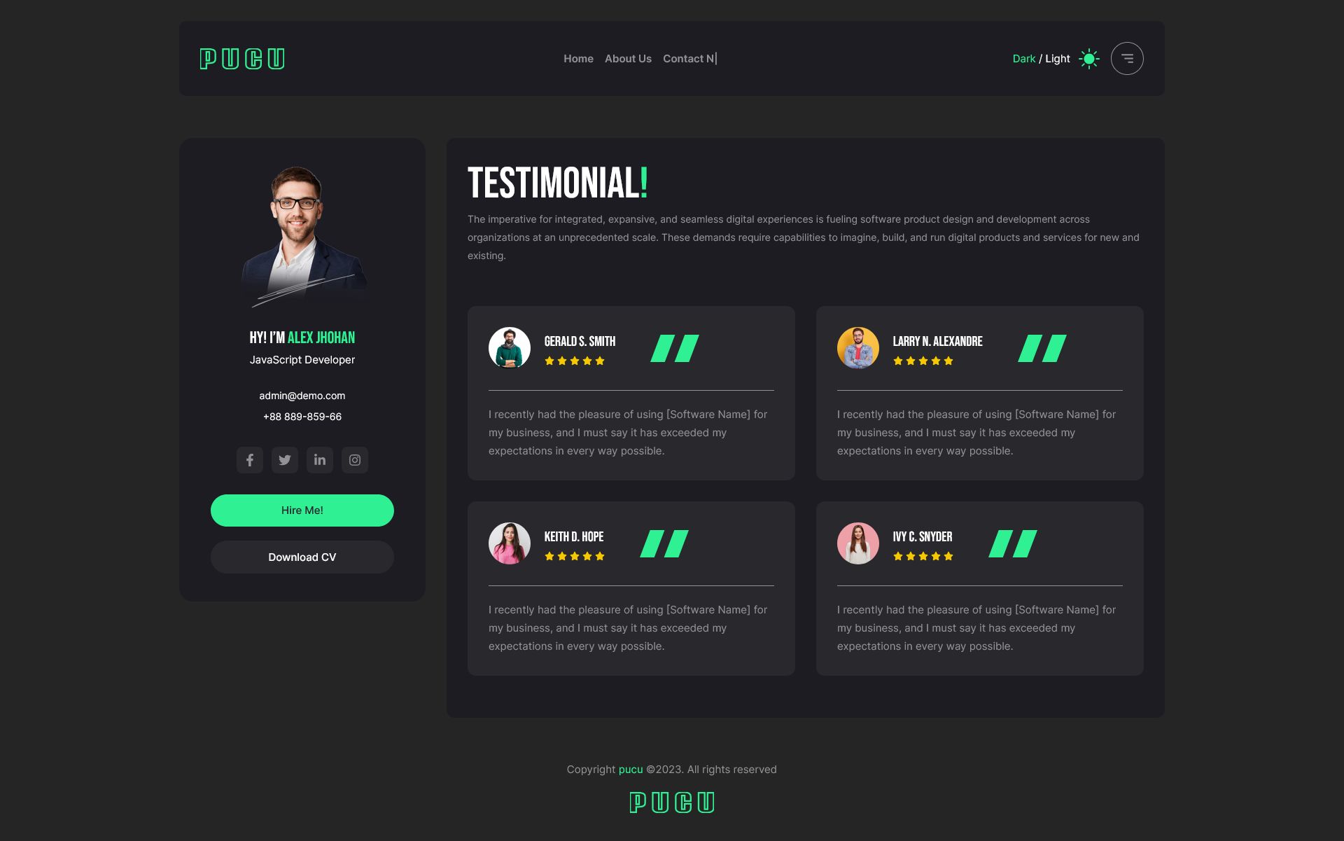Pucu is a modern, clean, and fully responsive React Portfolio Template built with Tailwind CSS. It is designed for developers, designers, creators, freelancers, and agencies who want to showcase their work in a professional and visually appealing way. With fast performance, reusable components, and a smooth UI, Pucu helps you build a standout portfolio with ease.