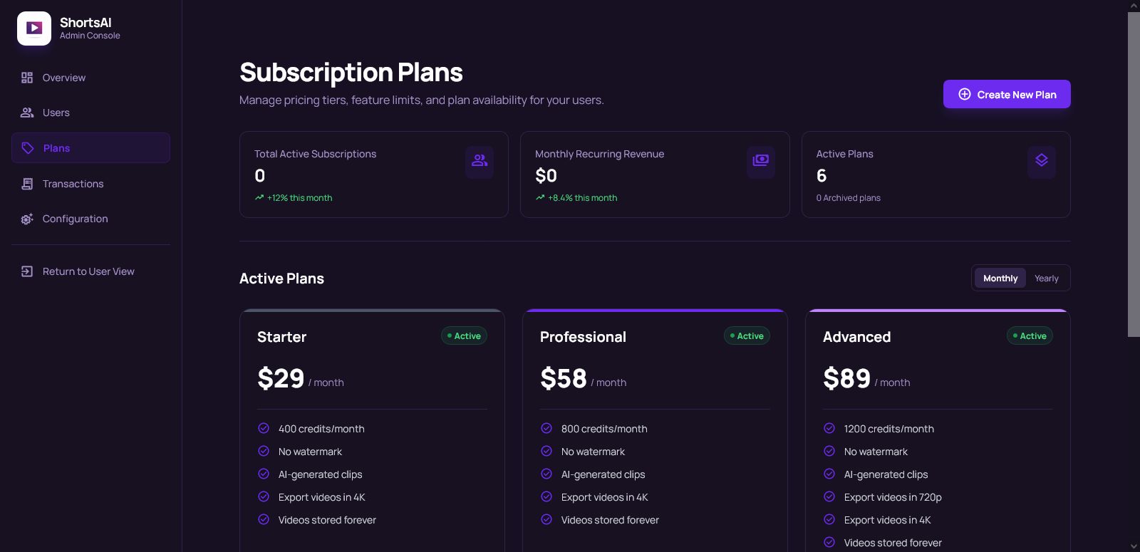 Designed for Business minded buyers, ShortsAI includes a full admin management system, complete user management, subscription plans, and Stripe payment gateway integration out of the box. Manage users, projects, billing, and settings from a powerful admin panel, making it ideal for launching your own AI video startup or adding short-form automation to an existing product.