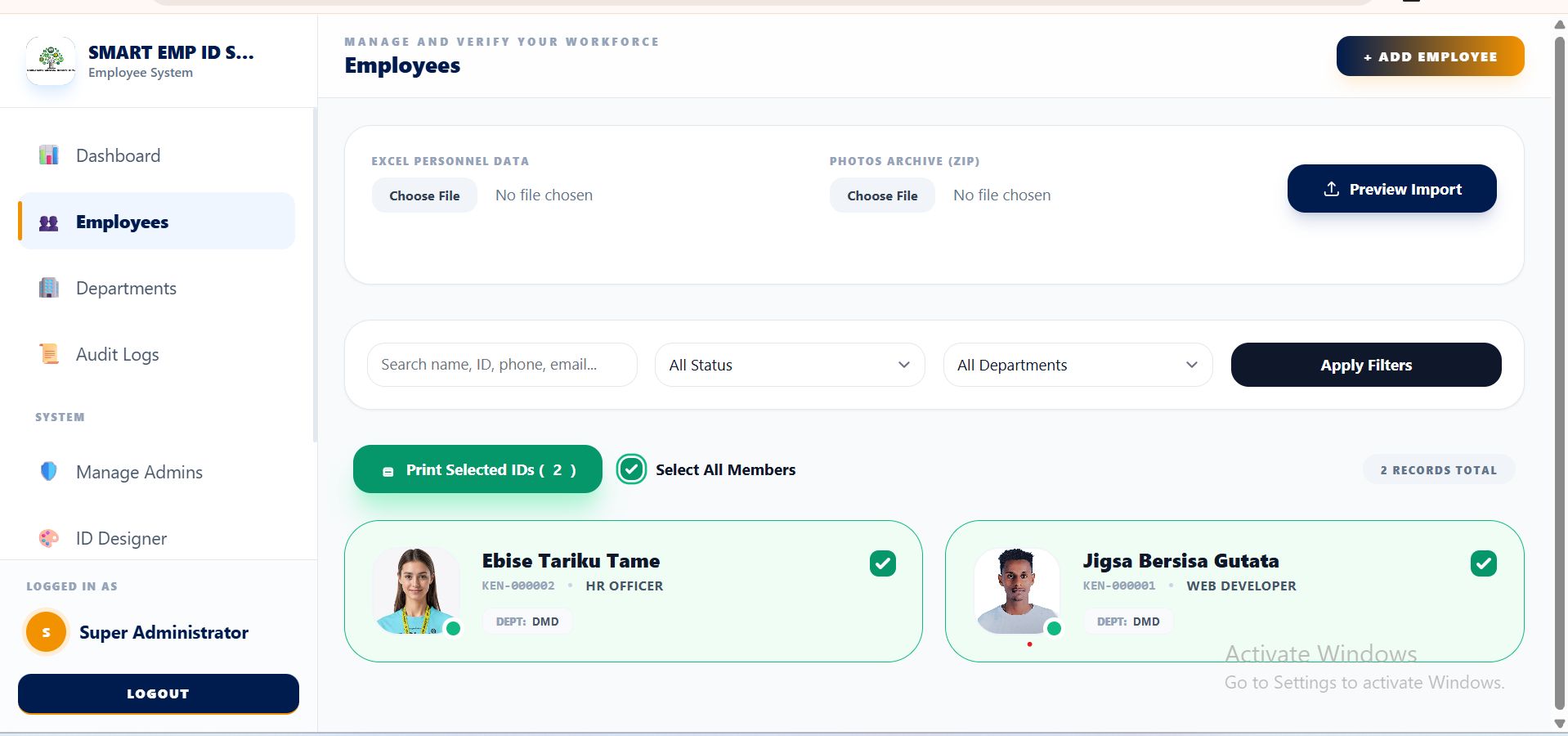 - Batch ID Printing: Select multiple employees and generate a consolidated, print-ready layout for high-volume ID production.