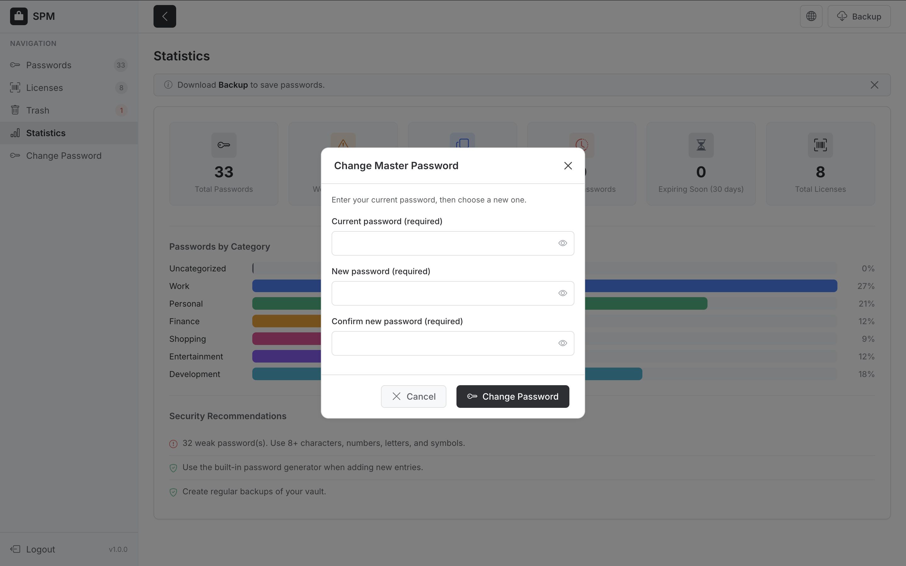 - Statistics - Total passwords/licenses, weak passwords, duplicates, expired and expiring soon items; passwords by category; security recommendations.