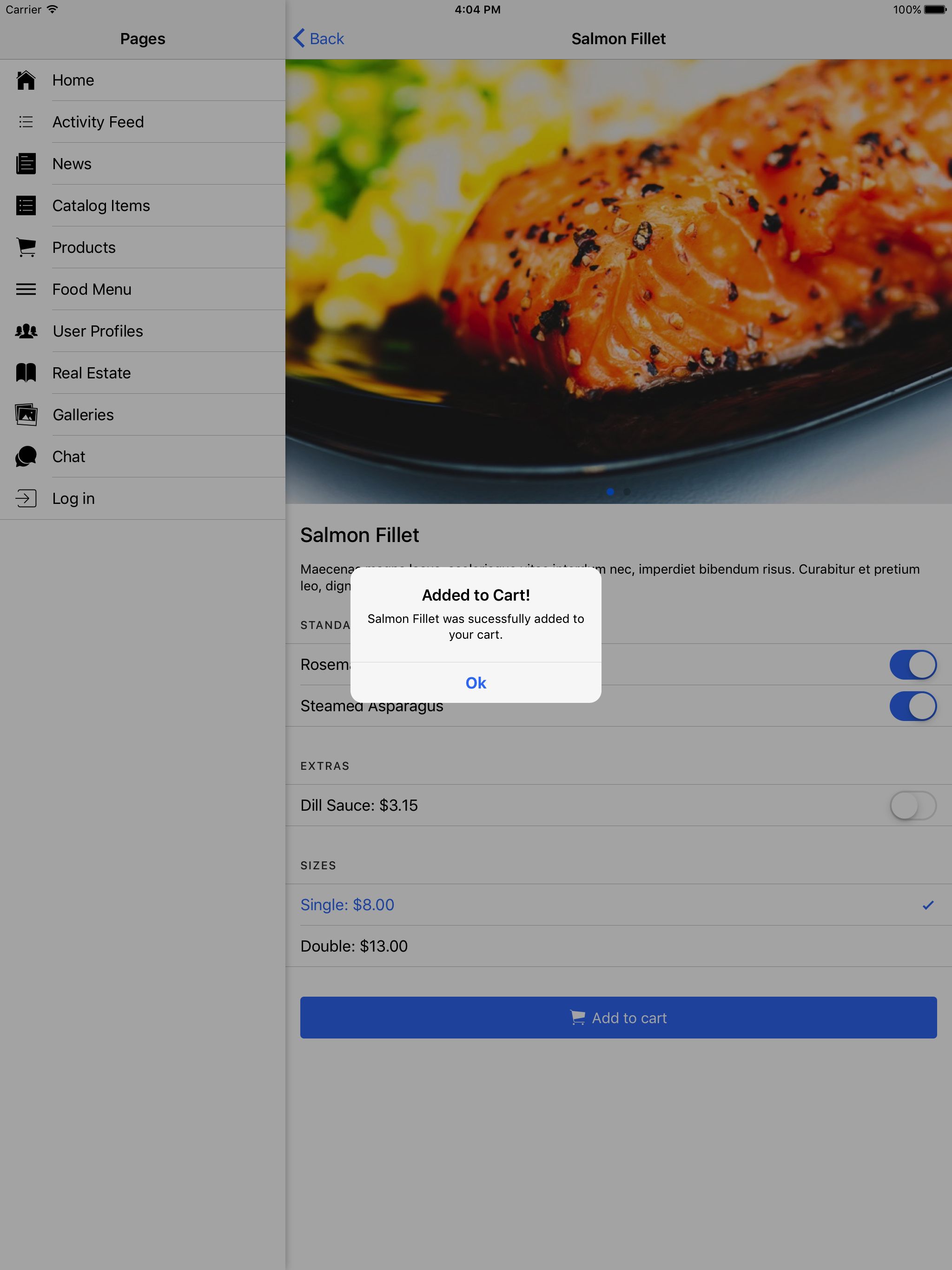 Menu items are presented with a title, a thumbnail and a price.A detailed screen of each menu item provides additional information including: