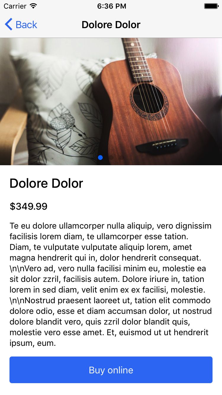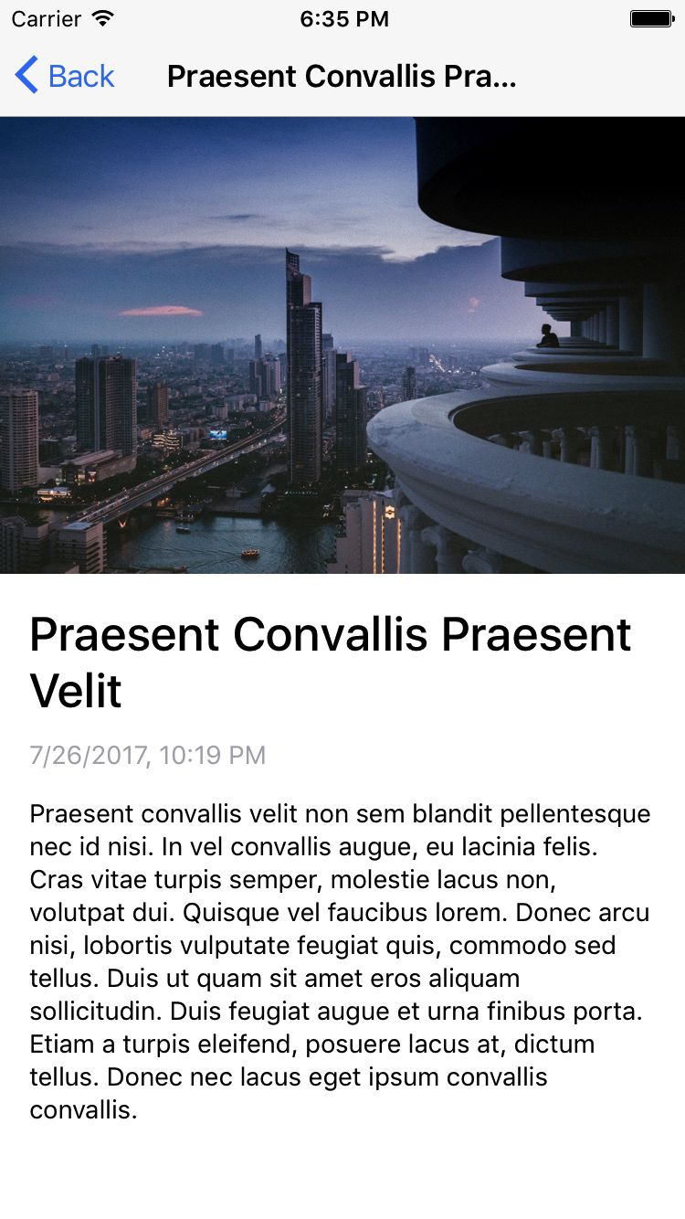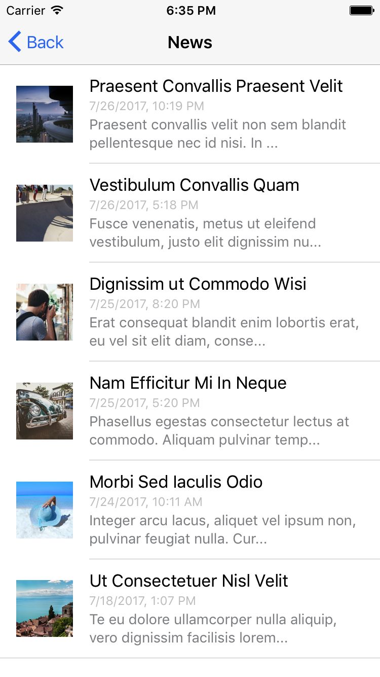 A master-detail pattern is used to display all articles in a list and the details of each article to another screen. Articles are represented by a photo, title, text and the date they were posted.Products