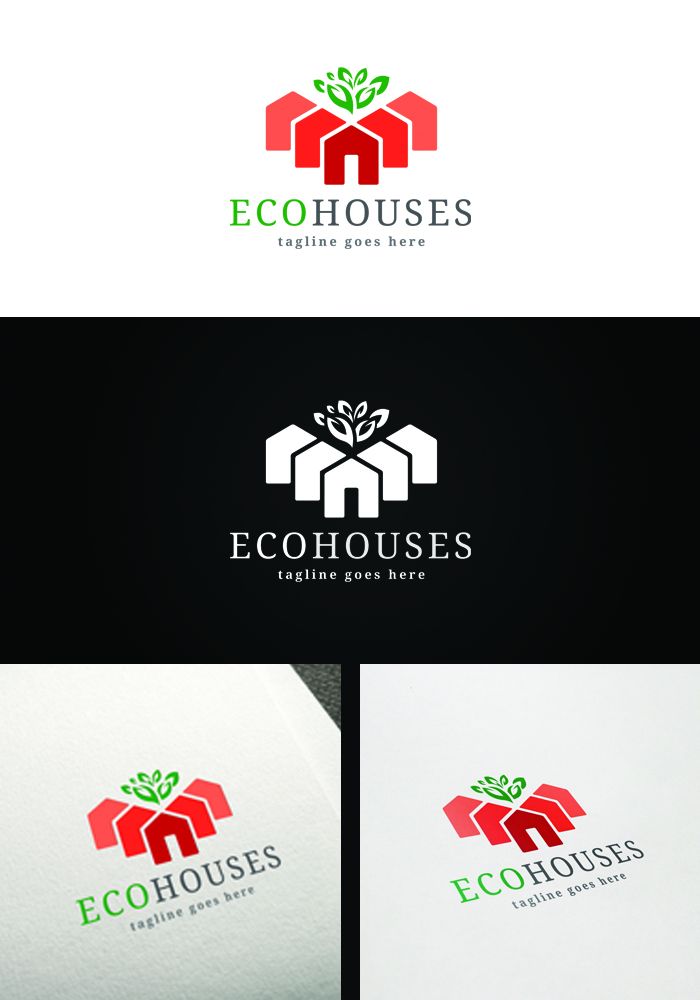 Unique and memorable Logo design consist of one group of five houses, placed one behind other and a leaves over them, showing an environmentally low-impact home with lower energy needs.