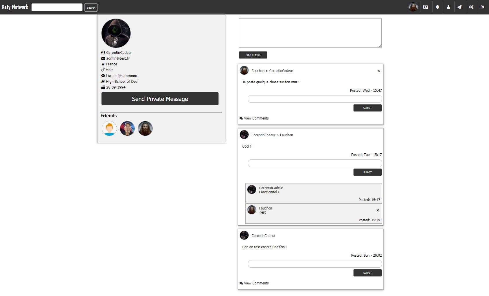 Daty is a social network that includes commentary space as well as instant messaging and add friend function. All this coded in php / mysql / jquery / Ajax